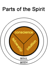 Just as our human being is tripartite, our human spirit is also composed of three parts: the conscience, fellowship, and intuition. The conscience is that part which enables us to perceive right from wrong and which, accordingly, either condemns or justifies us. Through the faculty of fellowship, we are able to contact God and commune with Him. Finally, through our intuition, God imparts to us a direct, particular sense or knowledge which is independent of reason, circumstance, situation, or precedent. These three faculties of the spirit, conscience, fellowship, and intuition, are clearly described in Scripture.